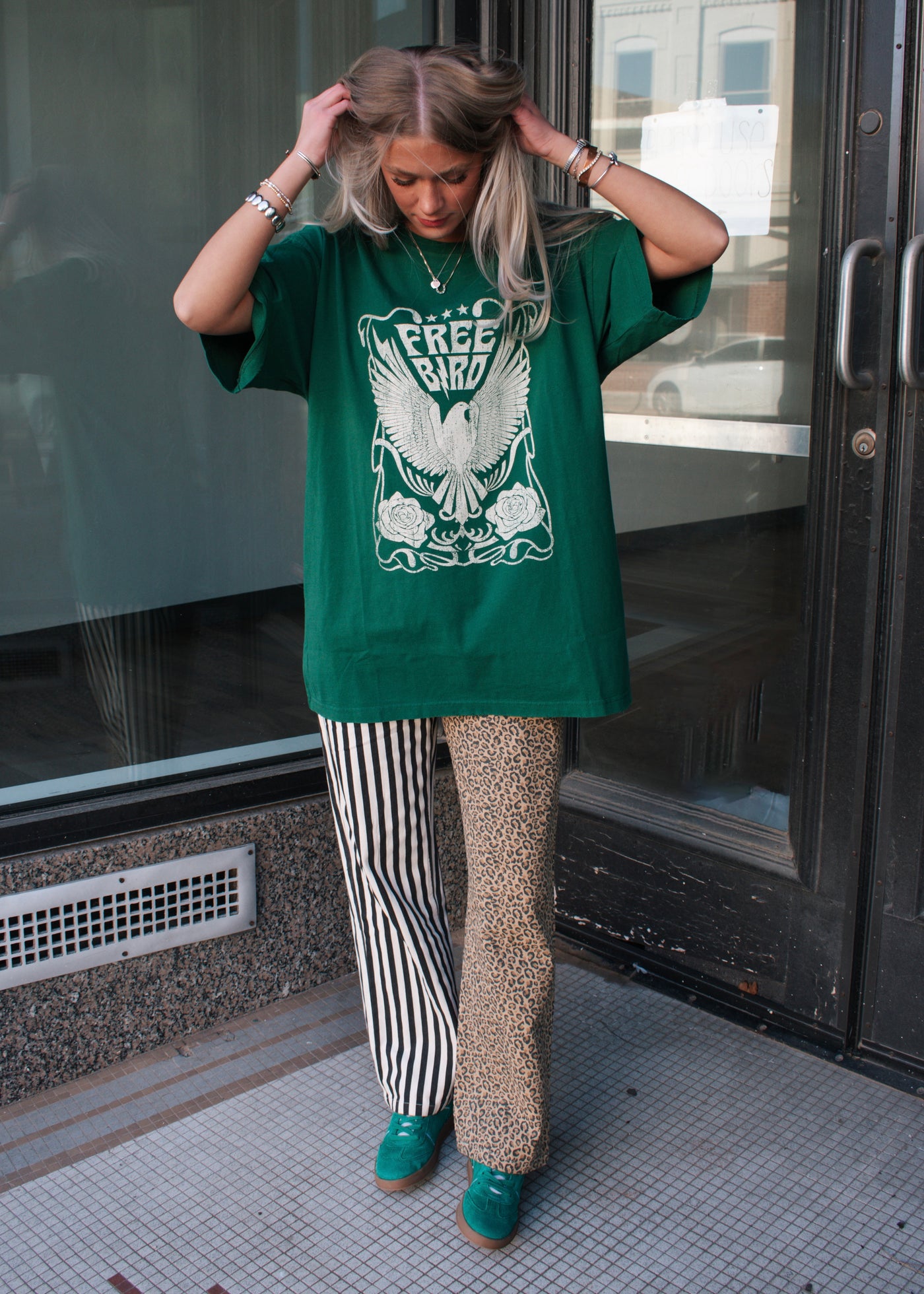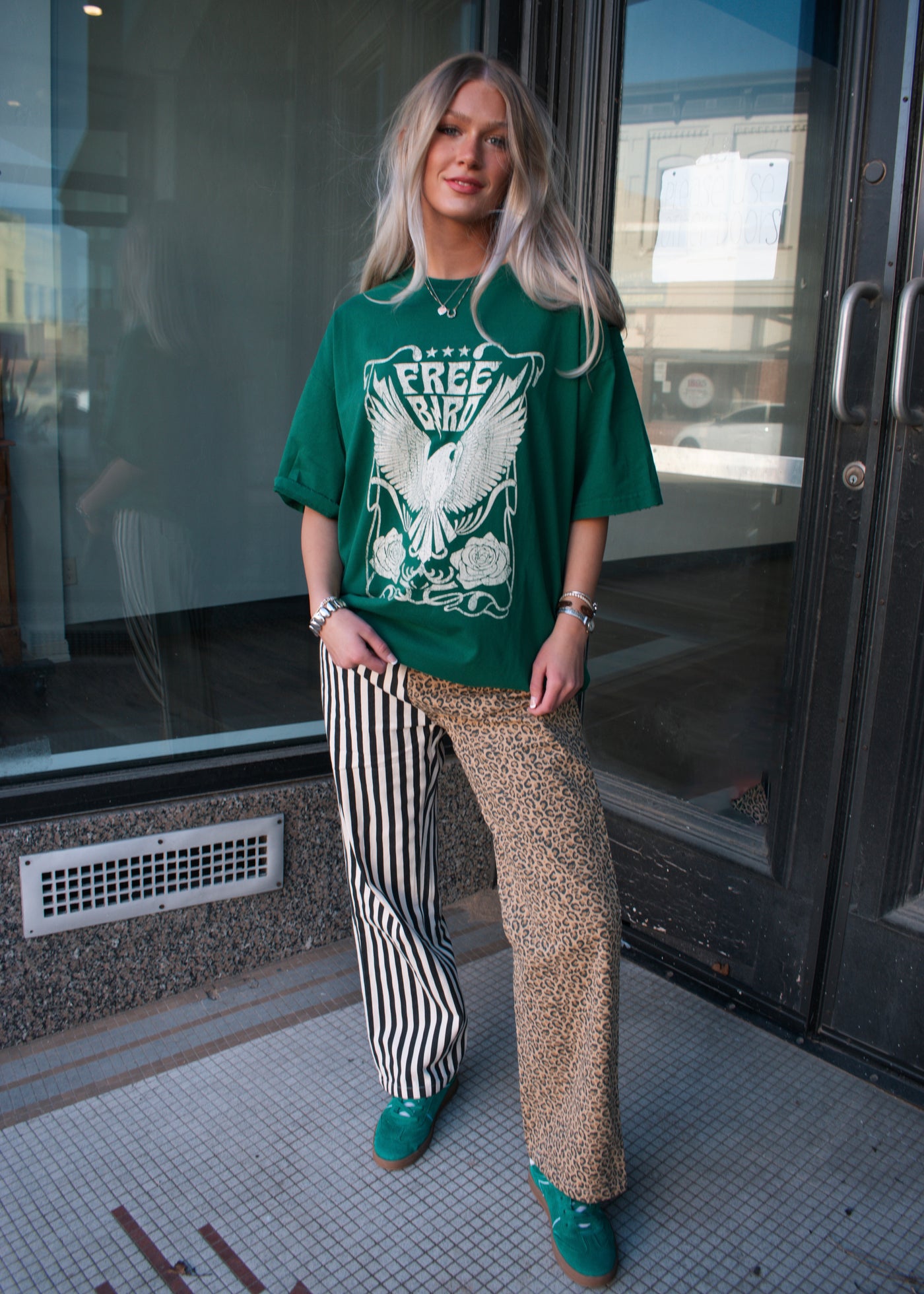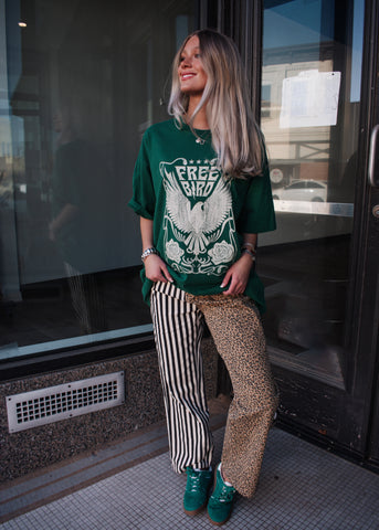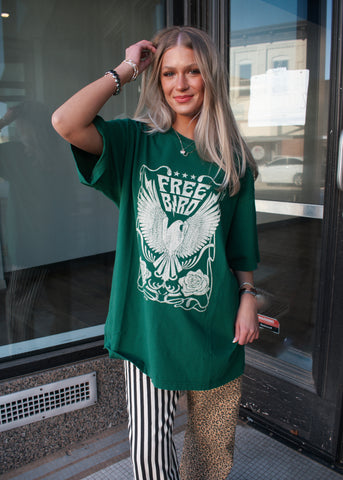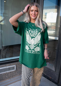 Easy, edgy, and effortlessly cool—this Free Bird graphic tee is made for laid-back days with a little attitude. Featuring a bold vintage-inspired eagle graphic on a rich green tee, this oversized fit gives you that worn-in, lived-in feel we all love. Style it with denim, leggings, or mix patterns for a fun, statement look.