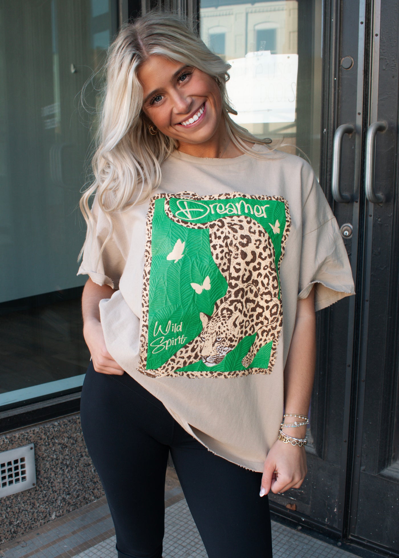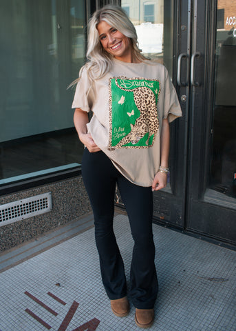 This effortless graphic tee is made for the free-spirited dreamer. Featuring a bold leopard print design layered with rich green accents, fluttering butterflies, and “Dreamer / Wild Spirit” script, this tee makes a statement without sacrificing comfort. The neutral tan base keeps it easy to style, while the relaxed fit gives it that laid-back, everyday vibe.