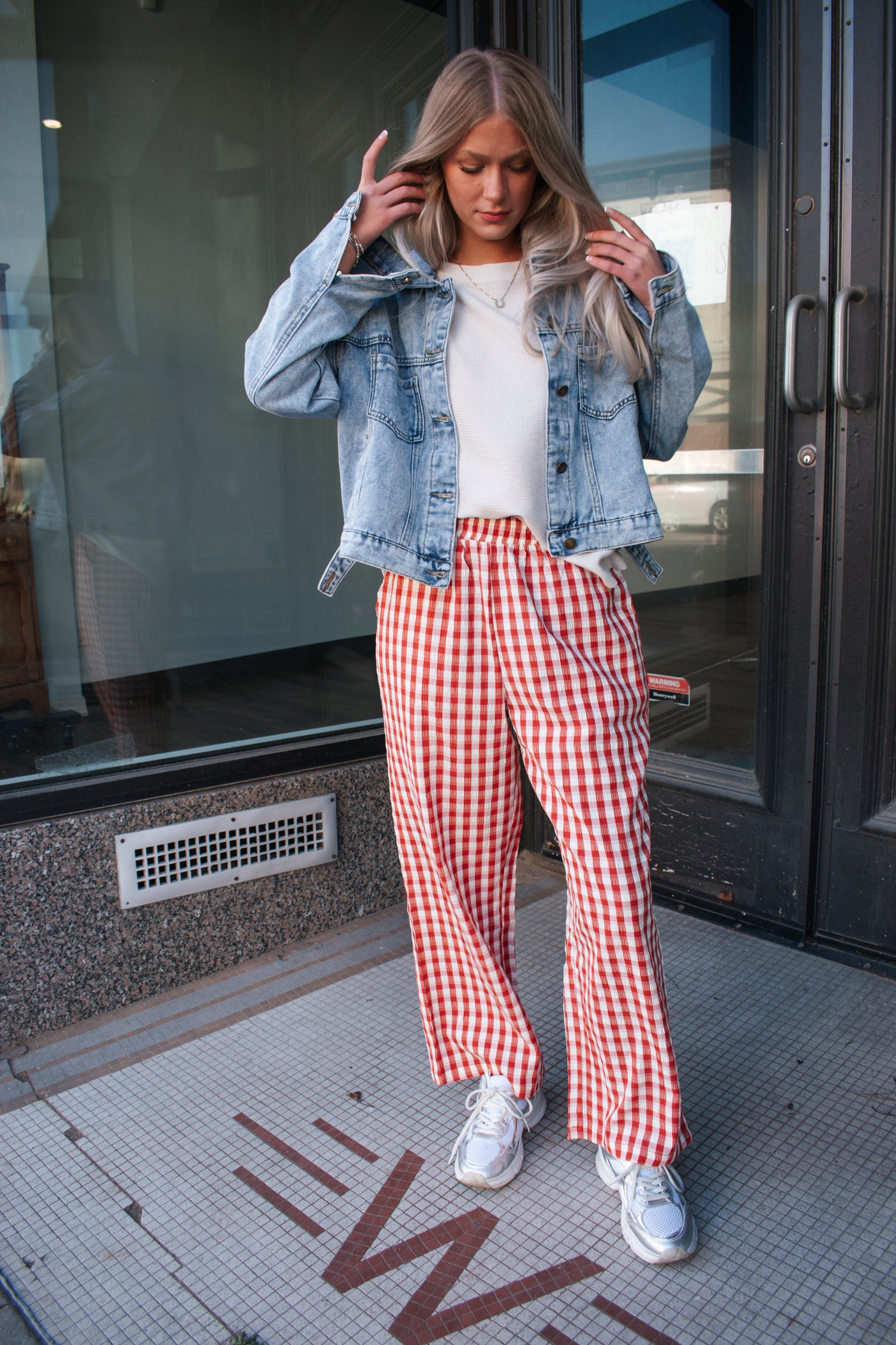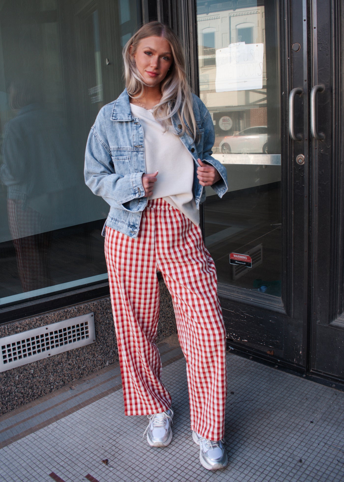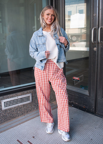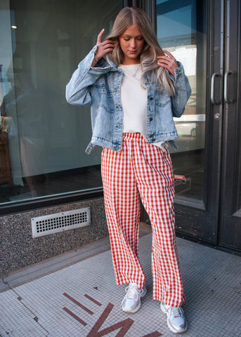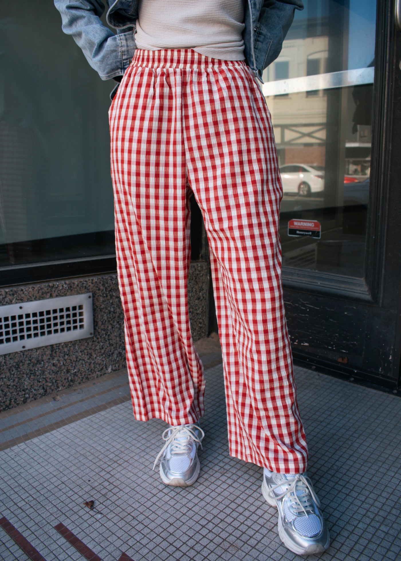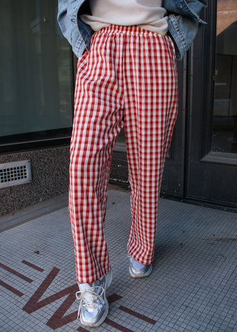 Elastic waist checker pants with side pockets