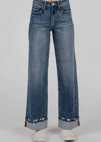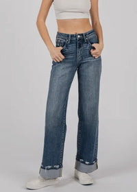 Soft high rise comfort stretch wide leg with cuffed hem jeans.