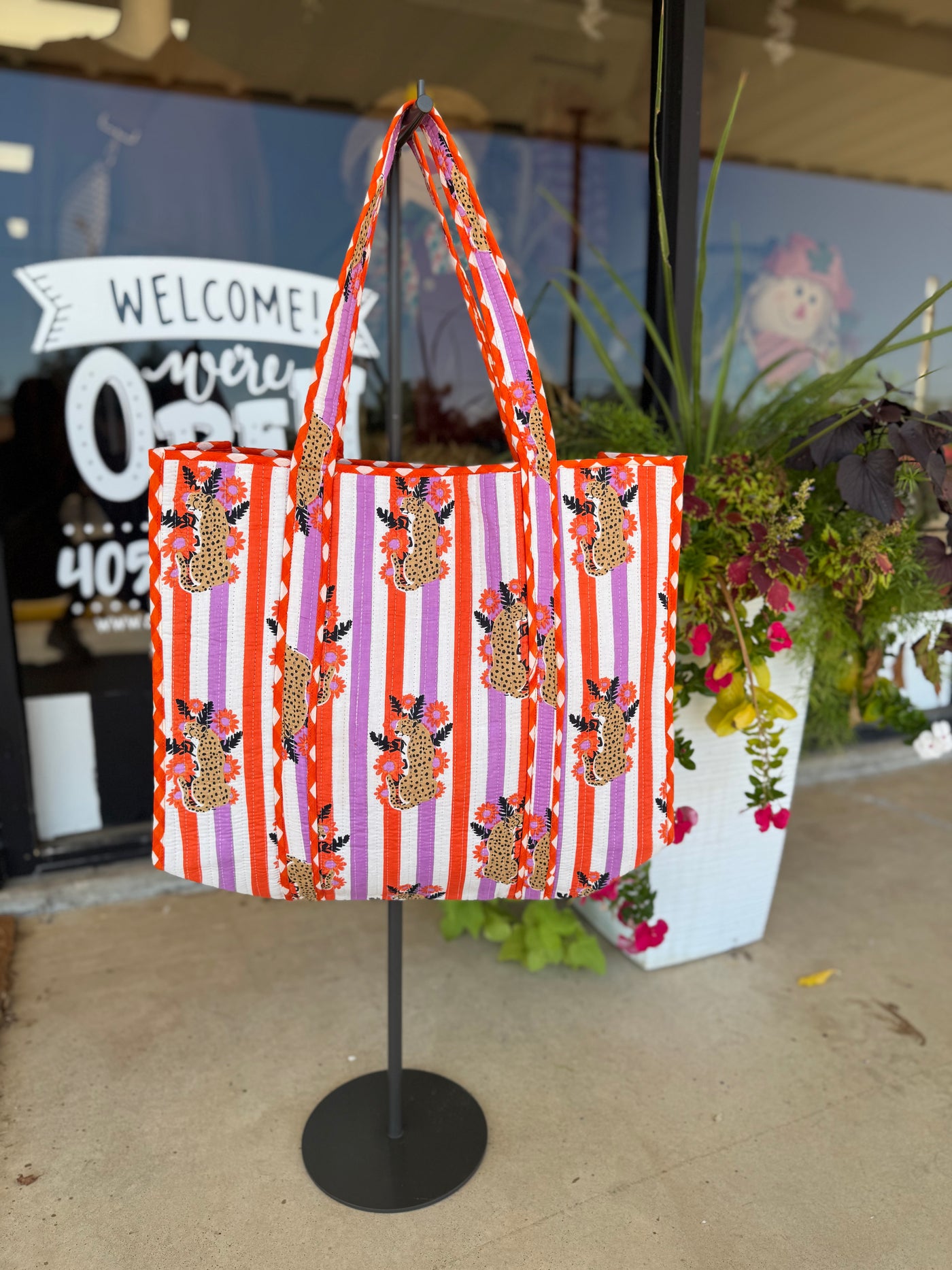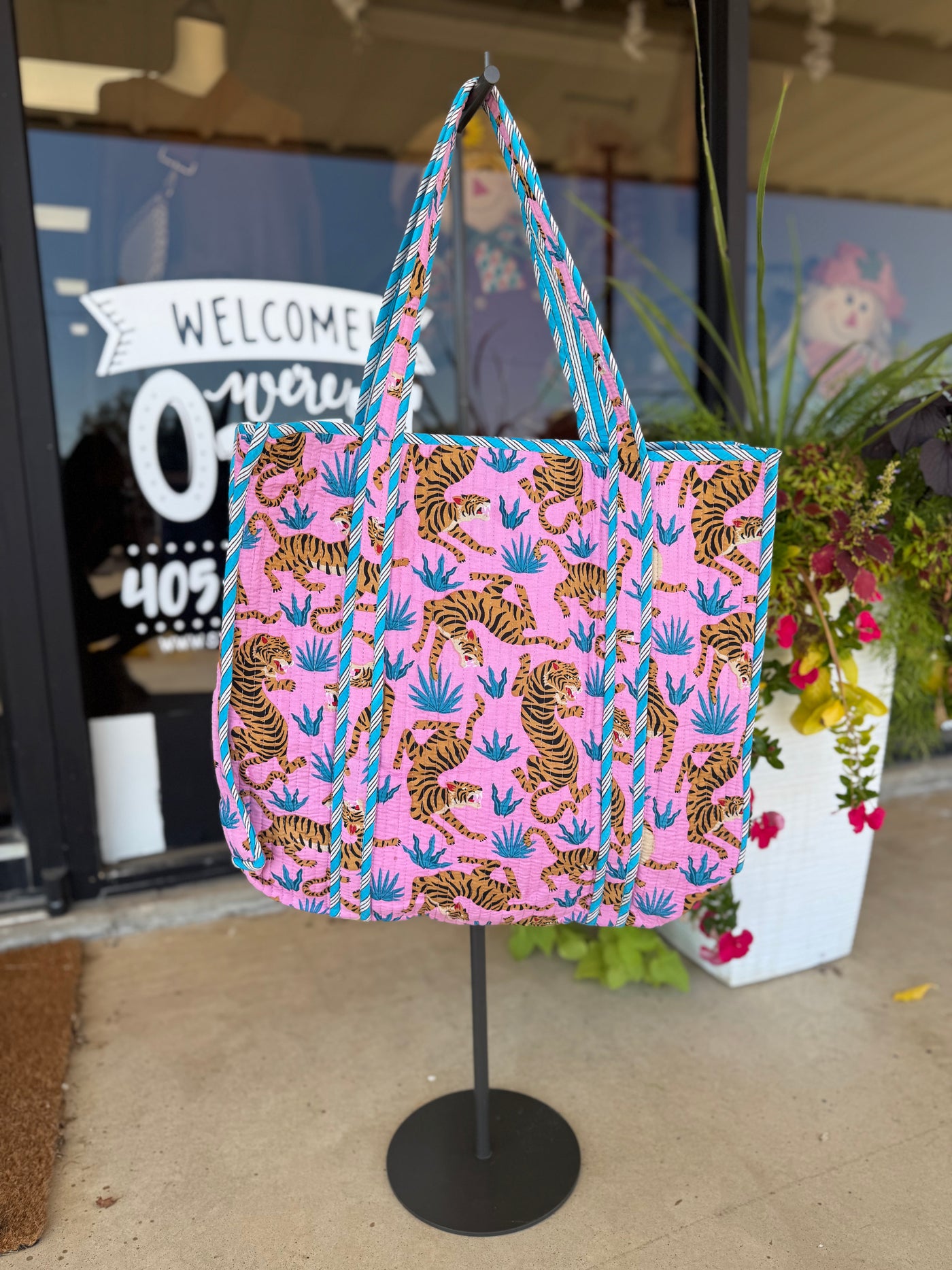 Reversible tote with contrasting interior - Interior pocket - 17.5" x 17.5" - 100% Cotton - Quilted block print fabric Perfect for: market tote, beach tote bag, weekender bag, overnight bag, large shopping tote, travel bag & more