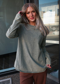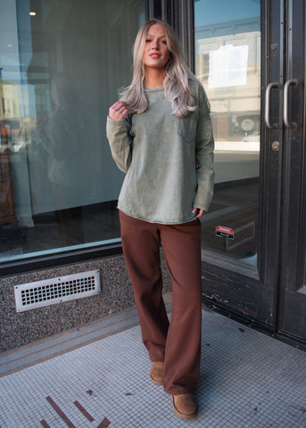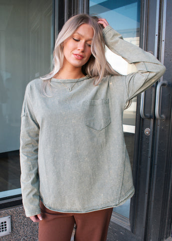 This laid-back essential is all about effortless comfort. Designed in a soft mineral-washed sage hue, this long sleeve features a relaxed, slightly oversized fit with a classic chest pocket for everyday ease. The lightweight feel makes it perfect for layering or wearing on its own through every season.