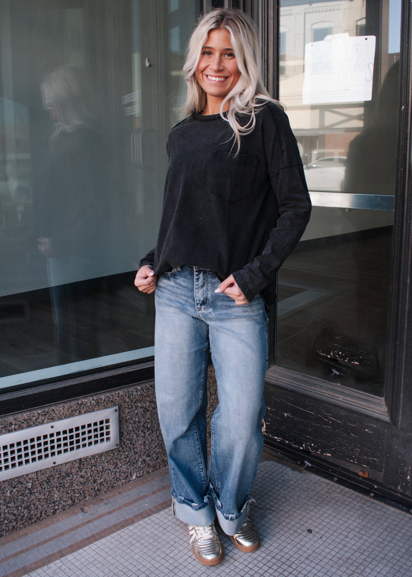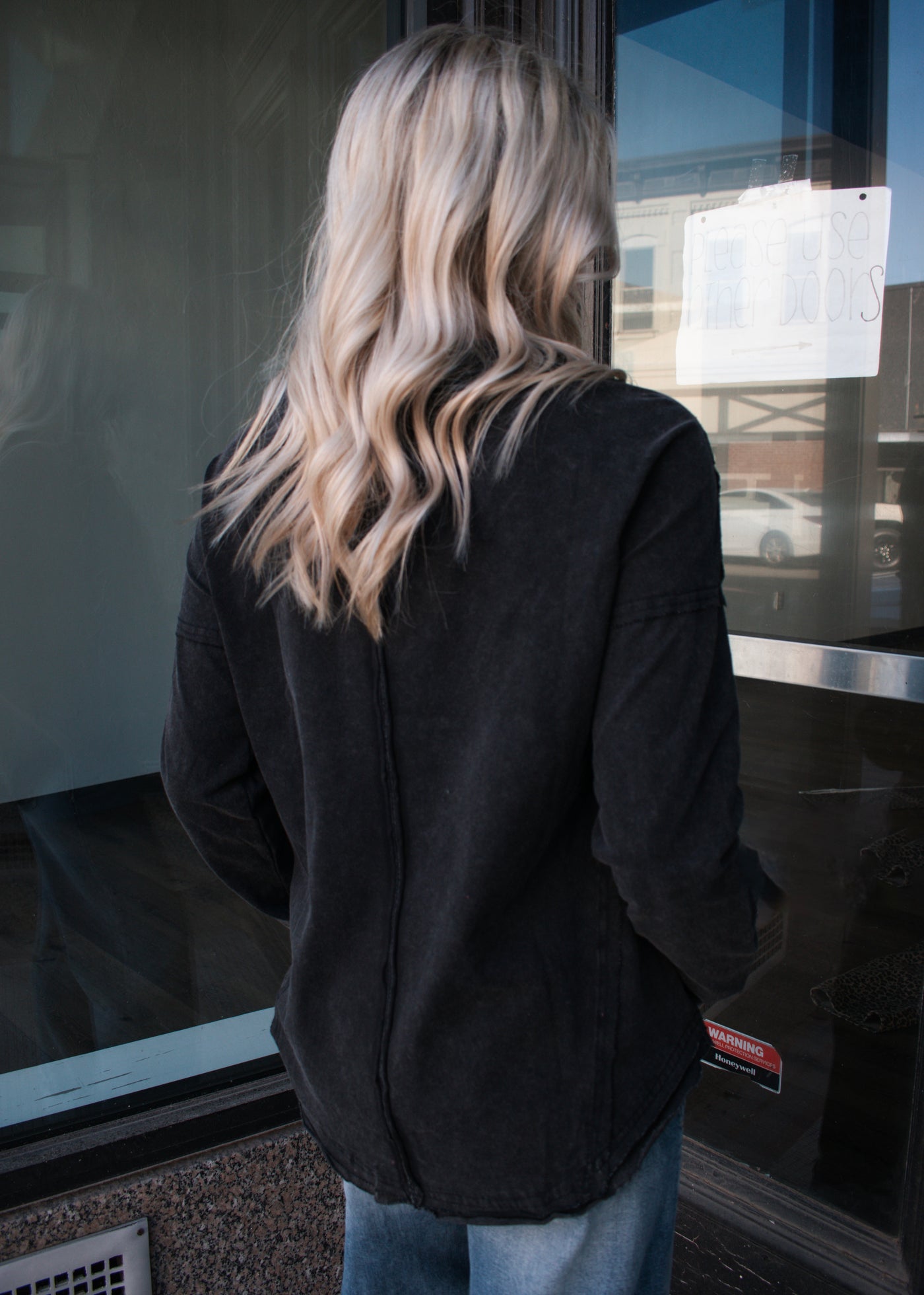 Mineral wash casual top, raw edge hem detail